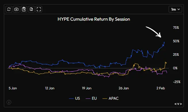 У цьому «червоному морі» HYPE проявляє себе як випадок відмінності, з американськими інвесторами, що відіграють значну роль у тренді зростання. Однак стверджувати, що потік капіталу просто повертається у сильний графік — недостатньо для пояснення структурної природи цього зростання.