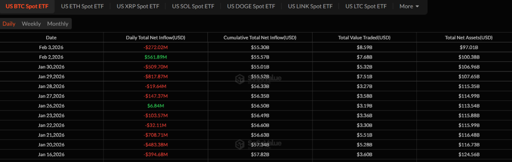 Згідно з даними SosoValue, ETF на спотовий біткоїн у США зафіксували приблизно $272 мільйони чистих відтоків 3 лютого, оскільки BTC короткостроково знизився до $73k. Ці відтоки продовжують недавню тенденцію виведення коштів на тлі зростаючої волатильності. З 16 січня спотові ETF на BTC зафіксували притоки лише двічі.