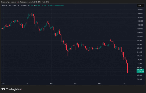 Згідно з даними TradingView, BTC упав нижче $60 000 у понеділок вранці, знизившись більш ніж на 50% від свого пікового значення. На момент написання статті перша криптовалюта відновилася до торгівлі на рівні $65 976. Навіть так, актив залишається нижчим більш ніж на 7% за добу.