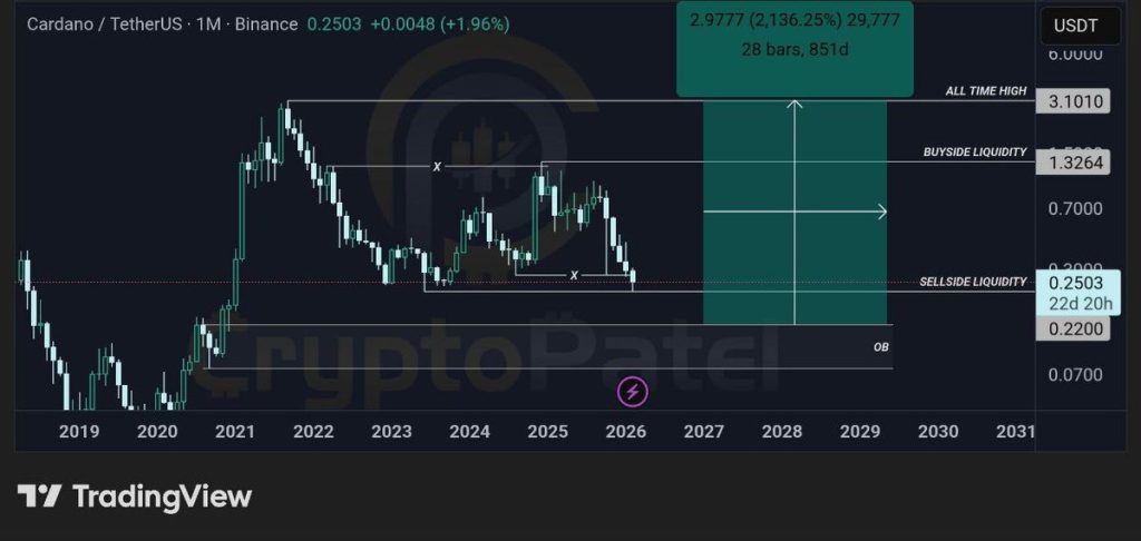 На місячному графіку ціна ADA фактично завершила повний перезапуск з історичного максимуму біля $3.10. Це був довгий шлях вниз, і тепер ціна опинилася всередині історичного рівня підтримки, який мав значення у минулих циклах.