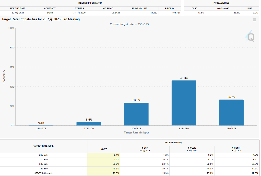За даними останнього звіту CME FedWatch Tool, після публікації даних щодо зайнятості, хоча ринок і вважає, що Федеральна резервна система (ФРС) у 3 та 4 місяцях цього року збережуть поточний рівень ставок, ймовірність зниження ставок у червні, що становить 1 крок, вже перевищує ймовірність залишення ставок без змін (41%), досягнувши 48,2%; у липні ж ринок прогнозує 46,3% ймовірності зниження ставок на 1 крок, тоді як ймовірність залишити ставки без змін знизилася до 26,5%.