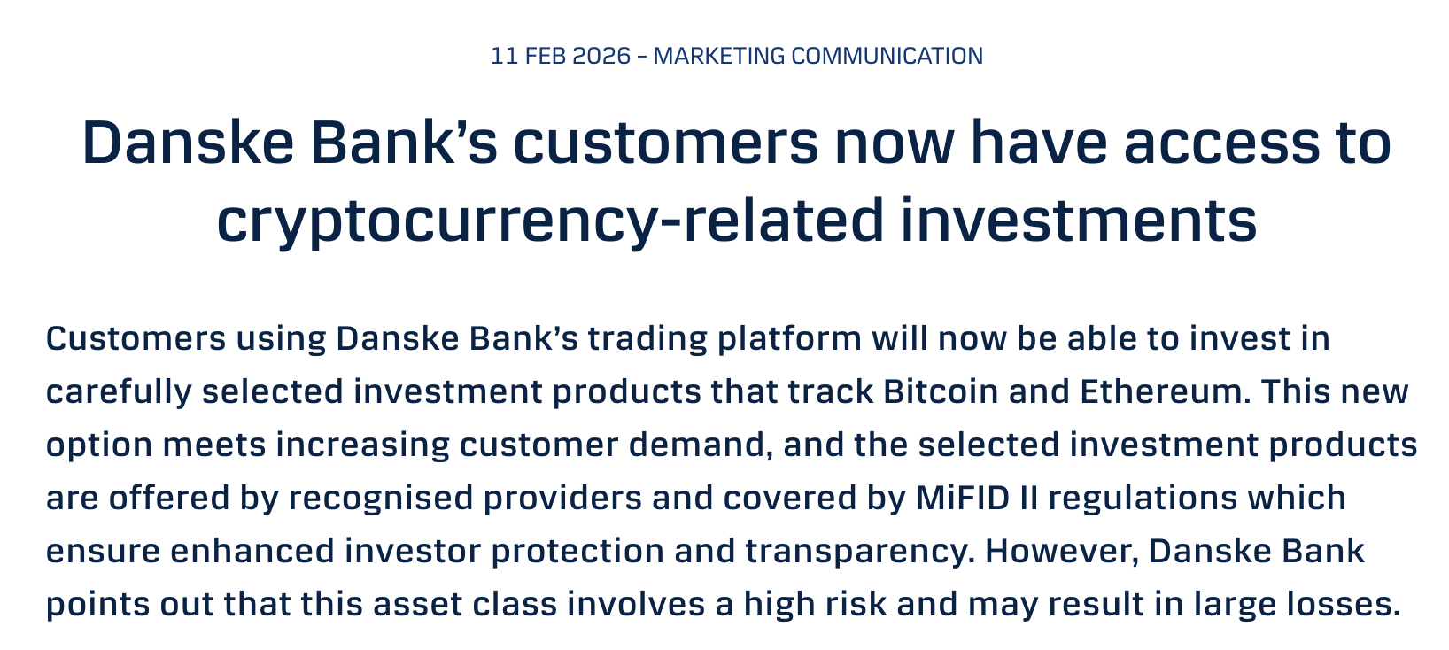 Зі впровадженням регулювання криптоактивів ЄС (MiCA) та зростанням ринкового попиту, ставлення традиційних фінансових гігантів Північної Європи суттєво змінюється. Найбільший датський банк, Danske Bank, учора (11/02) оголосив про відкриття для своїх роздрібних клієнтів можливості торгівлі криптовалютними деривативами (ETPs) на Bitcoin ($BTC) та Ethereum ($ETH).