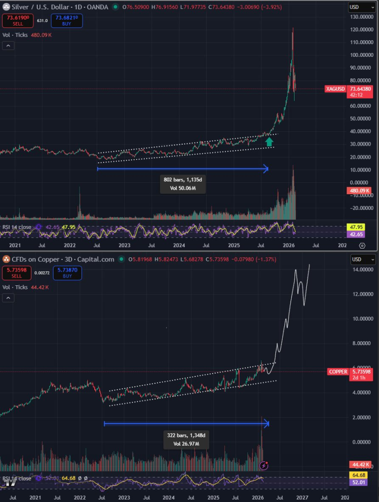 Bluntz фактично каже: “нудний” підйомний канал — це накопичення, а прорив — це частина, яка рухається так швидко, що пізні покупці не отримують чистих входів. Порівняння графіків має сенс, оскільки обидва метали демонструють один і той самий багаторічний grind, а потім той самий тип “клапана” руху, коли ціна прориває верхню межу.