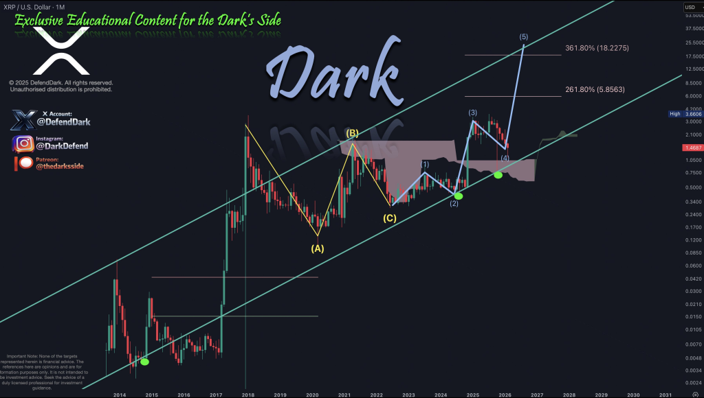 Dark Defender, відомий у X як @DefendDark, підкреслив цю структуру у недавньому пості. Він пояснив, що XRP рухається всередині висхідного трендового каналу з 2017 року, і що формація W тепер перетинає рівень Фібоначчі біля $18. Його погляд зосереджений на ідеї, що довгострокова структура має більшу вагу, ніж короткострокова волатильність для активу Ripple.