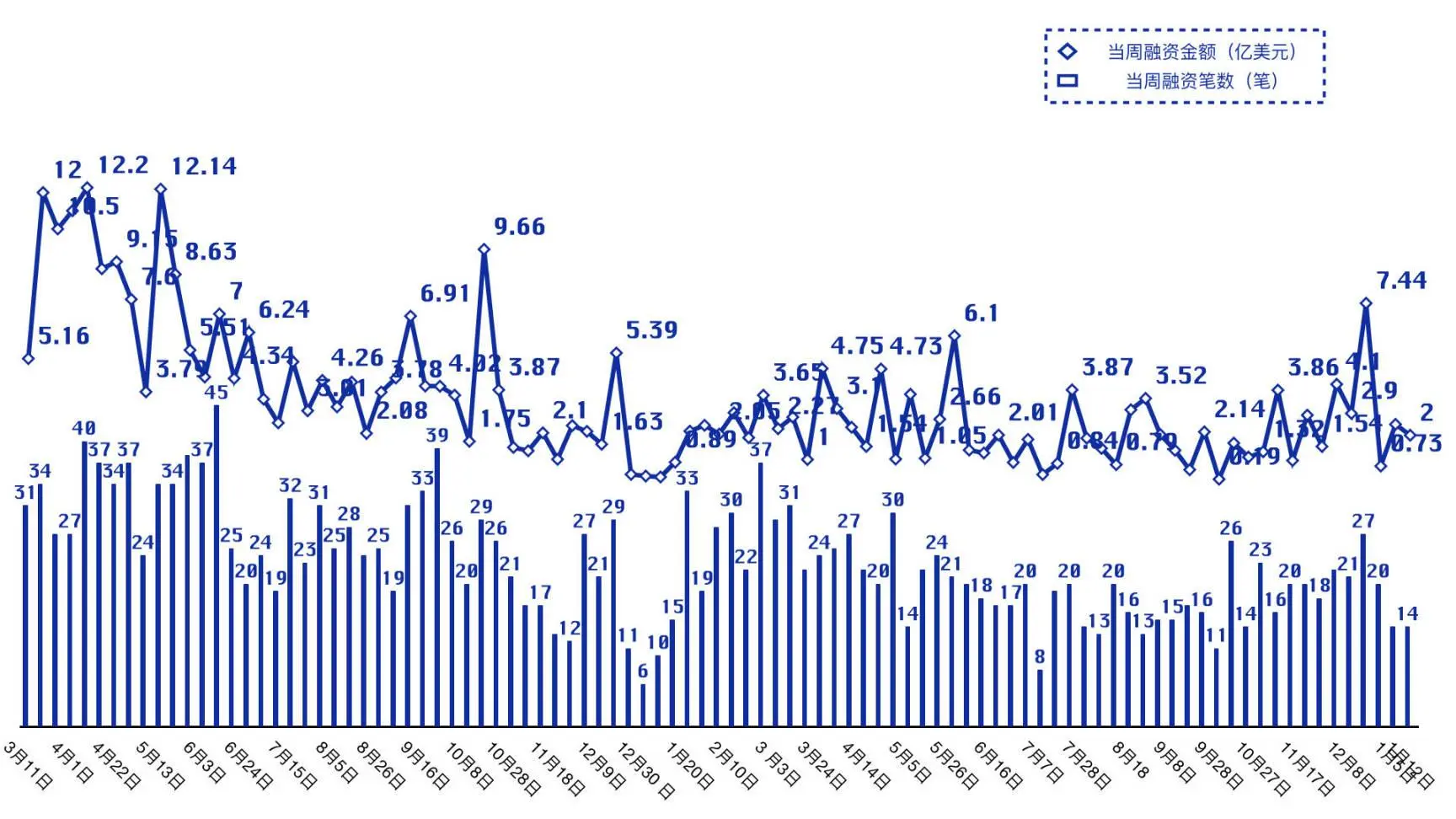Згідно зі статистикою Foresight News, у період з 6 січня 2024 року по 12 січня 2024 року на крипторинку відбулося загалом 14 інвестиційних та фінансових подій, у тому числі 3 в інструментах та інфраструктурі, 3 у сфері децентралізованих фінансів, 2 у сфері управління активами, 2 у ланцюжковій грі та полі невзаємозамінних токенів та 4 у сфері Web3. Загальна сума інвестицій та фінансування, що розкривається, становить близько 200 мільйонів доларів США.