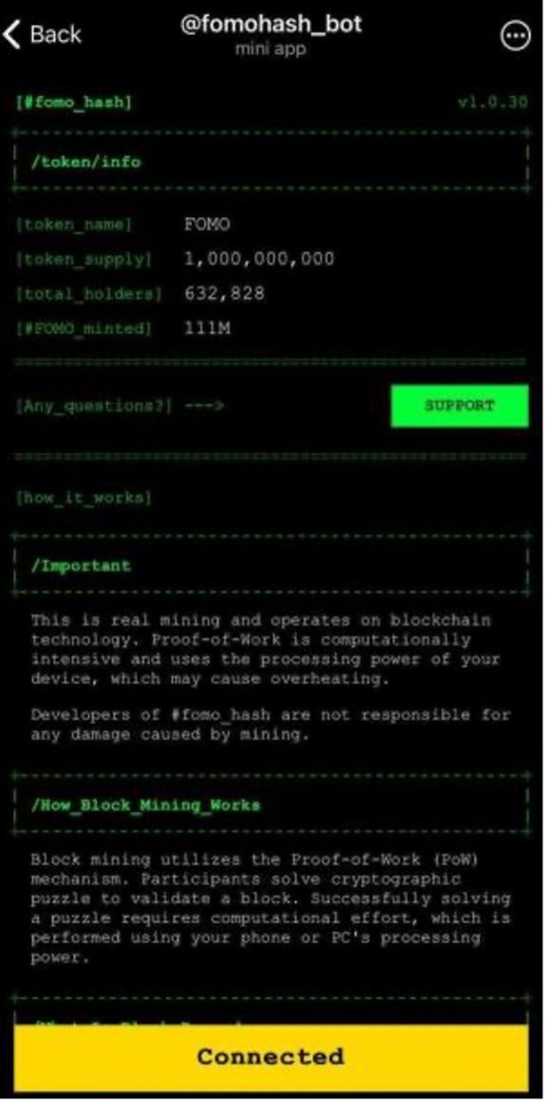 Успіх FomoHash також неможливий без потужного екосистеми Telegram. Як блокчейн мережа, яку підтримує Telegram, блокчейн TON завдяки своєму глибокому технічному базису та широкому охопленню користувачів надав важливу підтримку швидкому зростанню FomoHash. За допомогою понад 10 мільярдів активних щомісячних користувачів Telegram, TON охоплює кілька країн і регіонів у всьому світі, ці користувачі мають природні цифрові характеристики та високу прийнятність, що відкриває нову перспективу для просування блокчейн-проектів FomoHash.