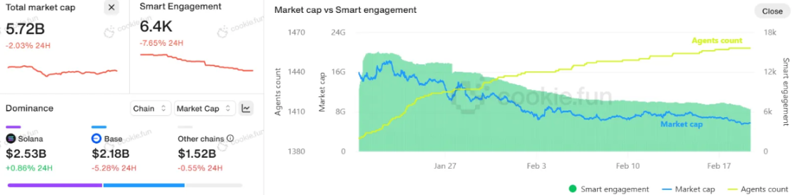 Гомогенізація агентів: більшість з 16 тисяч AI-агентів на платформі є токенами соціальних KOL (наприклад, AIXBT) або ‘віртуальними ідолами’, які приєднуються до гарячих тем. Їх функціонал обмежується лише на ретвітінг твітів або генерації простих фраз, і вони далекі від ‘революційного AI’. Тим часом кількість нових агентів також стрімко скорочується, і лише 18 лютого було введено в експлуатацію 4 нових агента.