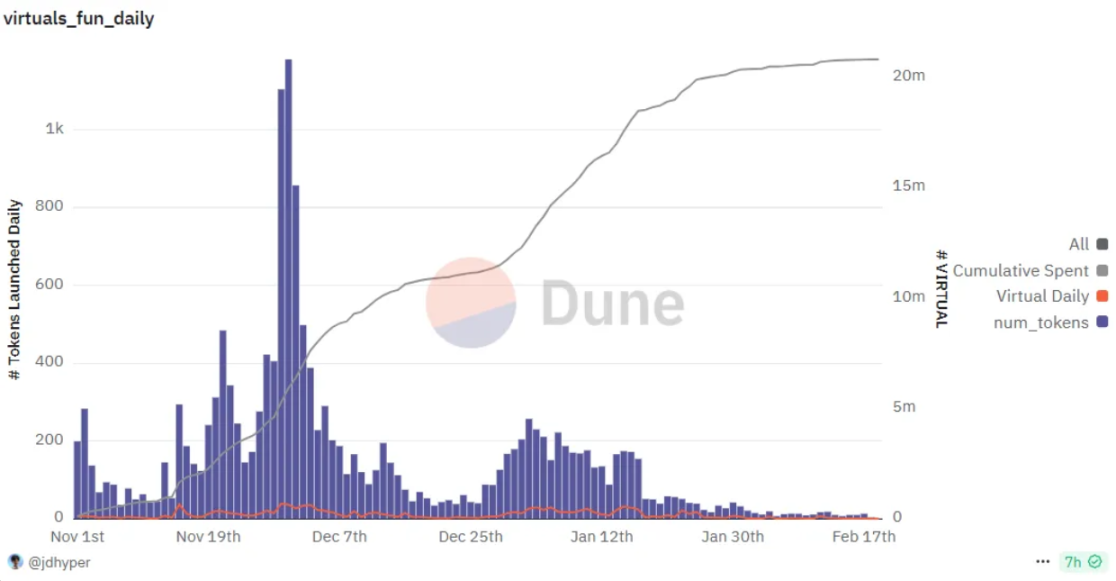 25 січня Virtuals оголосив про вступ до екосистеми Solana, і на ринку цей крок був сприйнятий як важливий крок «імперії штучного інтелекту». Команда планує реплікувати успішну модель, запущену на ланцюзі Base, завдяки п’яти великим ініціативам, таким як торговий басейн Meteora, стратегічний резерв SOL (SSR) та інші. Однак дані з першого показу Solana 12 лютого розігнали всі мрії.