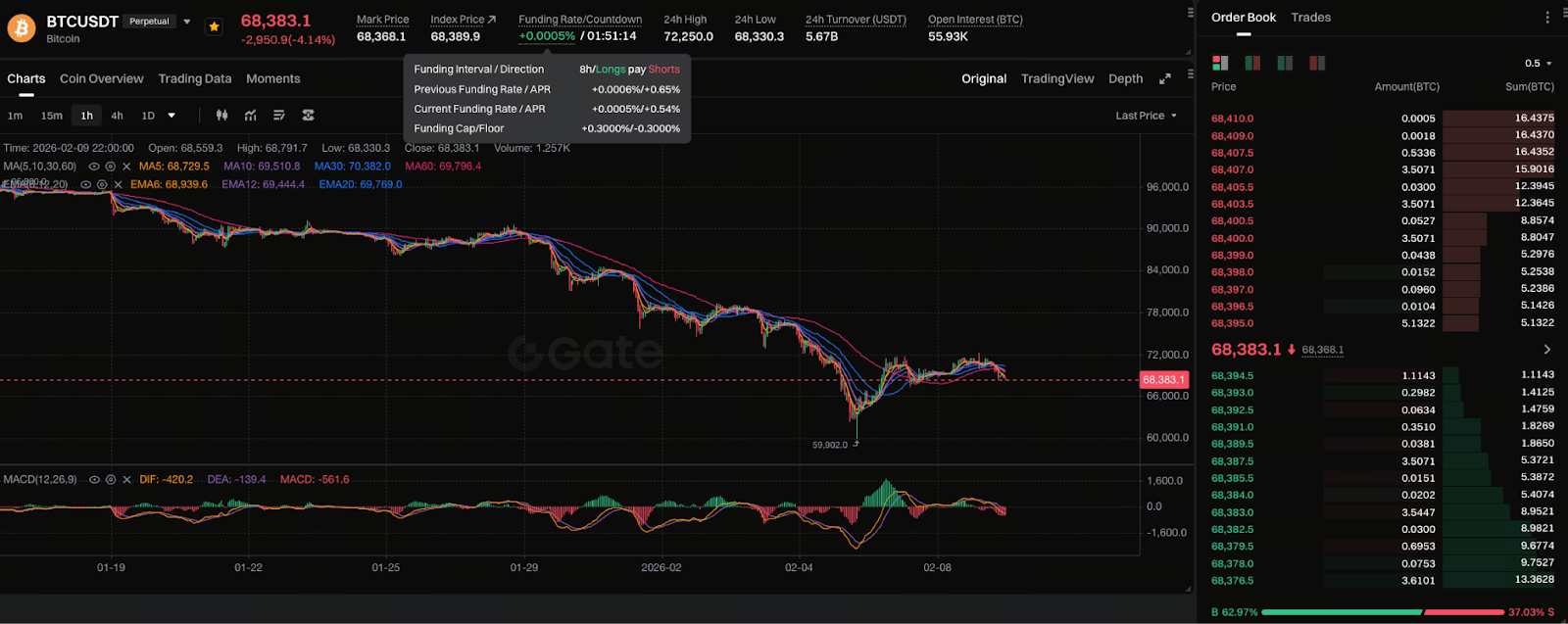 Trên giao diện giao dịch hợp đồng của Gate, người dùng có thể quan sát rõ ràng: