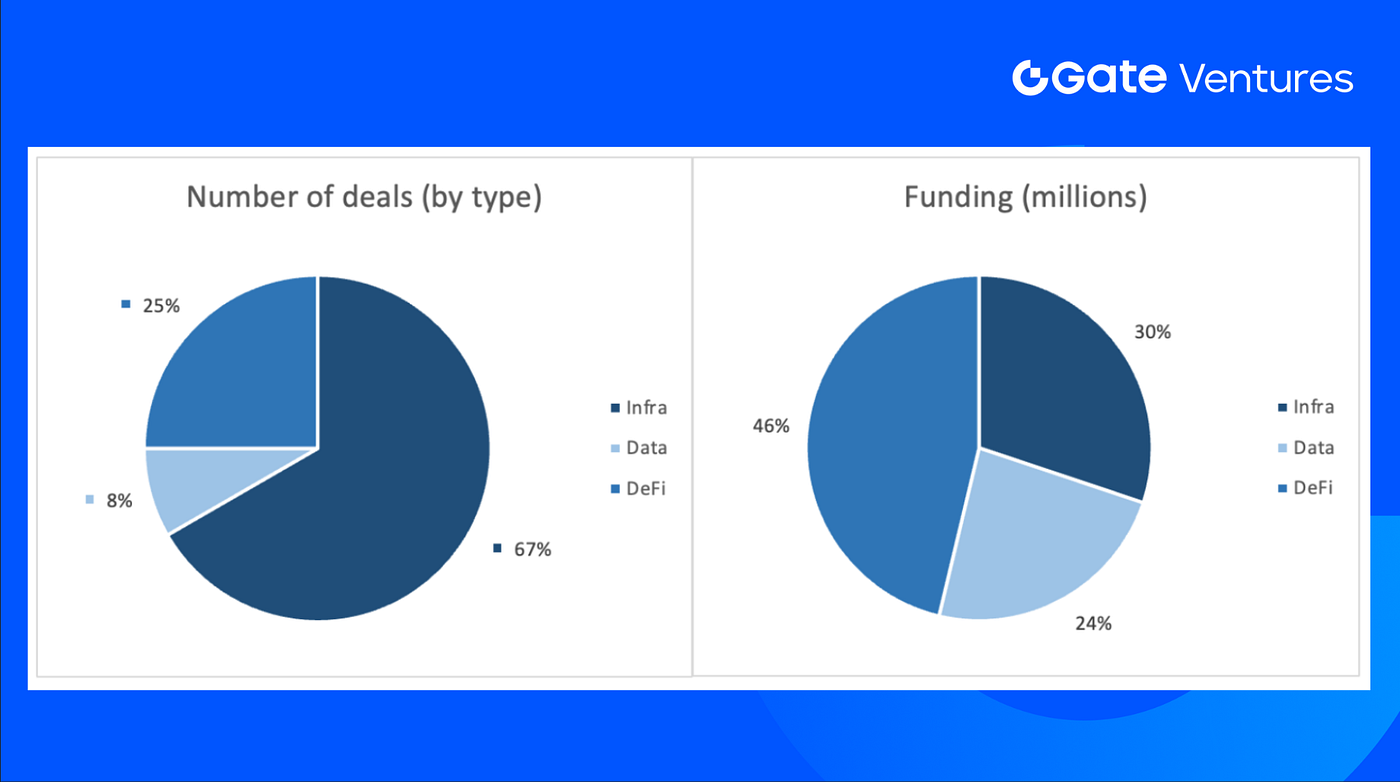 Tuần trước hoàn tất 12 thương vụ, trong đó Infra có 8 thương vụ, chiếm 67% tổng số. Defi có 3 thương vụ (25%), Data có 1 thương vụ (8%).