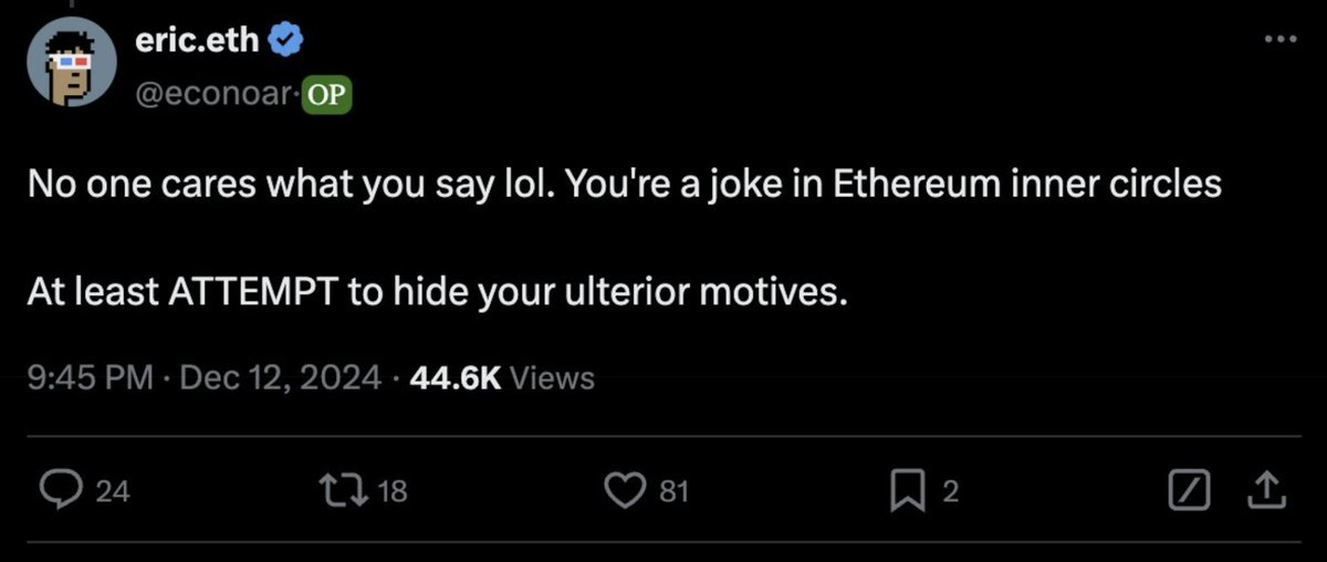 Những người làm việc tận tâm ở EF (so với các công ty FAANG và phòng nghiên cứu AI) bị ghét vì họ kiếm tiền và hỗ trợ một giao thức không phải Ethereum, mà là giao thức riêng muốn làm Ethereum tốt hơn.
