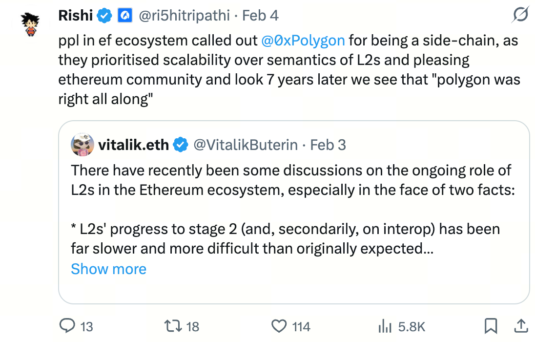Ethereum chưa bao giờ công nhận Polygon là L2 thực thụ, dù họ đóng vai trò lớn trong việc bảo vệ giá trị cho ETH. Nếu tin rằng rollup là phần mở rộng “văn hóa” của Ethereum, tại sao không công nhận thứ gắn chặt với bảo mật và sử dụng của Ethereum?