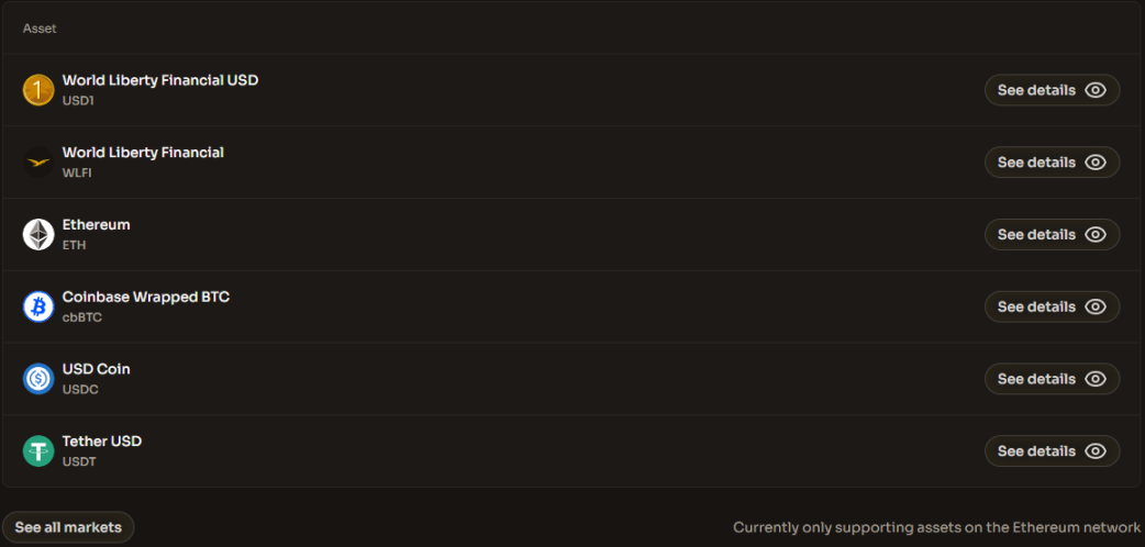 Các đồng tiền được hỗ trợ trên WLFI Markets | Nguồn: WLFI Official Website