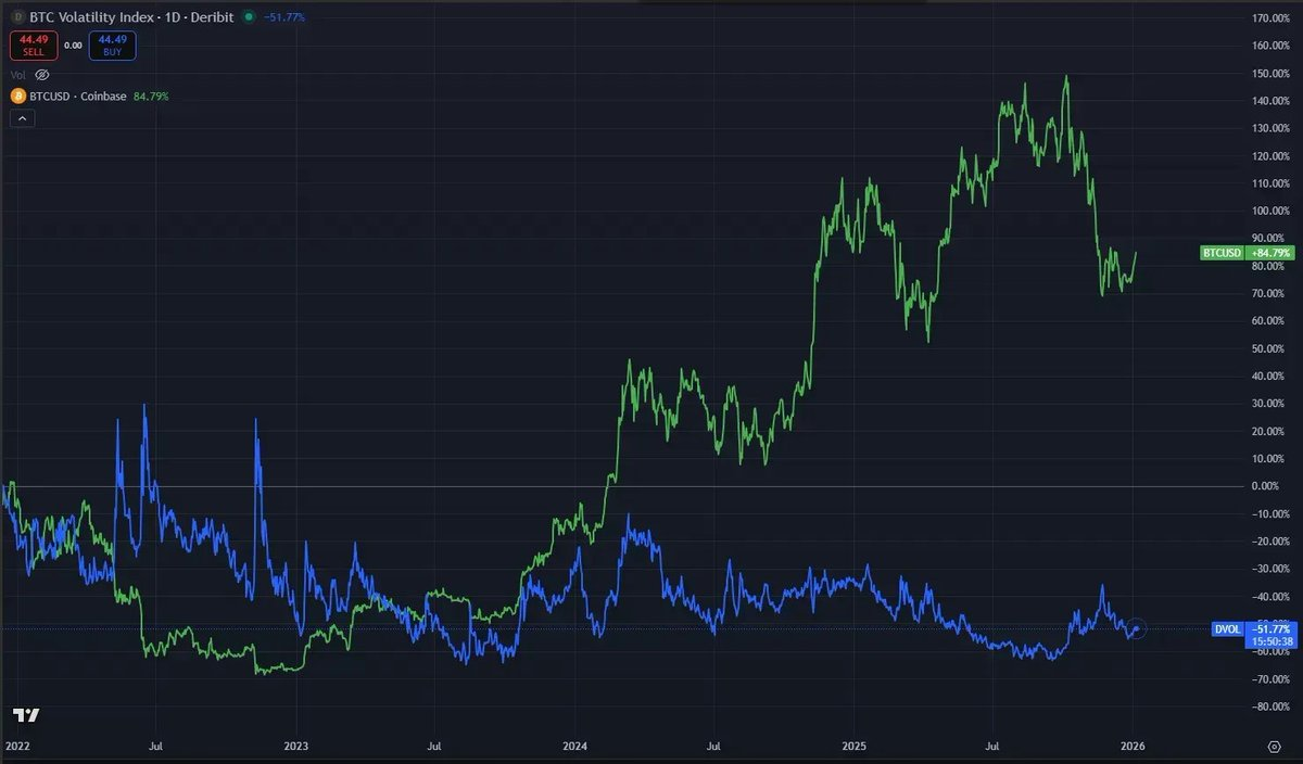 2025 年 8 月,比特币价格首次突破 12 万美元时,DVOL 接近局部低点。期权市场并未对持续风险给予足够的补偿。