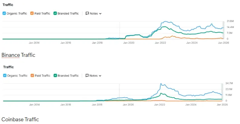从 Binance、Coinbase 等几家头部 CEX 的站点流量可以看到:自 2021 年牛市峰值以来,整体访问量持续下行,即便 BTC 创出新高也未显著恢复。与隔壁 Robinhood 的火爆形成鲜明对比。更多可以阅读我们去年写的「Where are the marginal buyers」