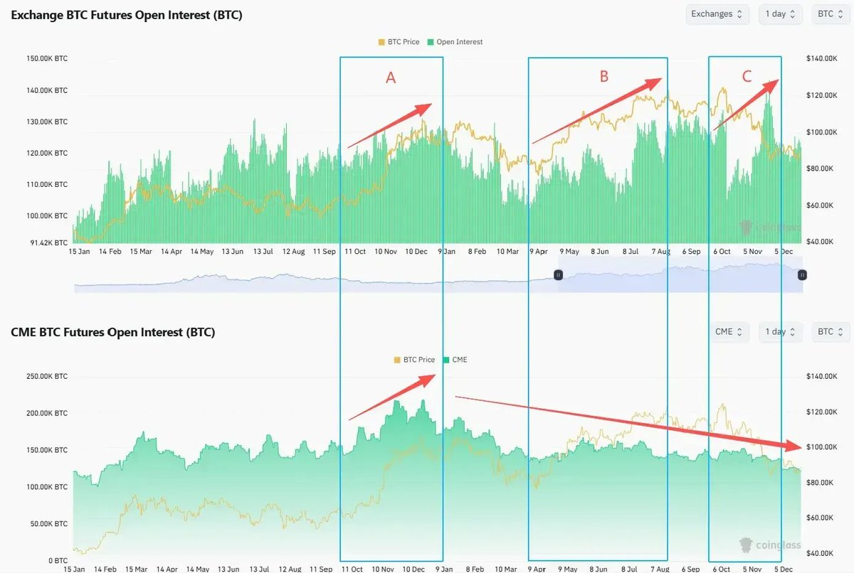 以 BTC 计价的 offshore OI (以 Binance BTC OI 为例) 在 B、C 两个阶段持续走高,杠杆率上升,即便 10·10 杀杠杆后短线回落,随后也很快恢复到高位,甚至创下新高。相对而言,以 CME 为代表的 onshore 期货 OI 从 2025 年初开始便持续下行,在价格创出新高时并未同步回升;