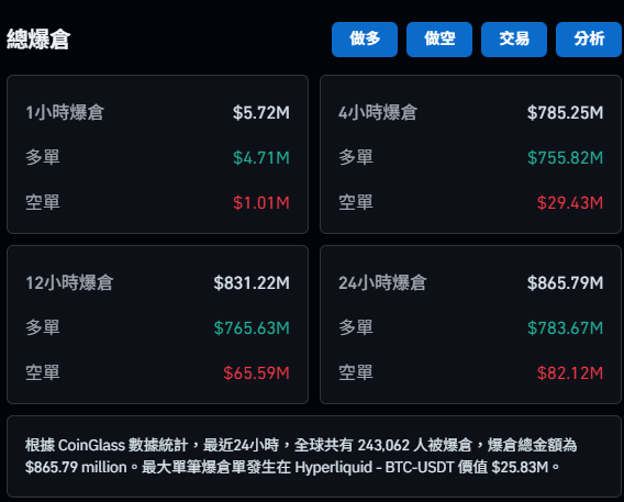 CoinGlass 的數據顯示,最近 24 小時內加密貨幣永續合約市場爆倉 8.6 億美元,其中絕大多數來自多頭部位(買漲訂單),報倉金額達到 7.83 億美元。