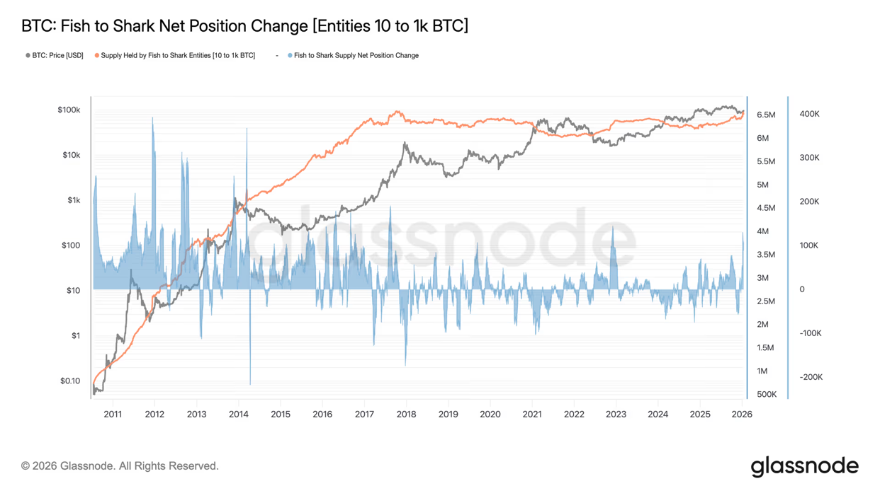 根據 Glassnode 的數據,持有 10 至 1,000 枚比特幣的魚到鯊魚群體,在最近 30 天內逆勢增持了約 110,000 枚比特幣,創下自 2022 年 FTX 事件以來的單月最大增持紀錄。