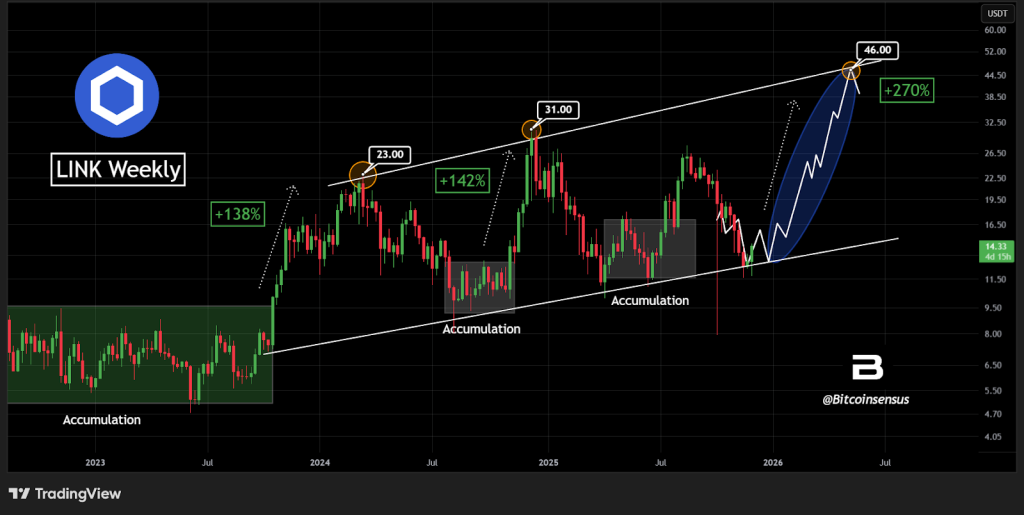 Nếu phe bò không thể kiểm soát thị trường ở mức hiện tại, Chainlink có thể giảm xuống dưới $12 trong vài phiên tới. Tuy nhiên, giữ vững mức hiện tại, kết hợp với hành vi mua mạnh mẽ có thể kích hoạt một đợt tăng 270% theo dự báo của Bitcoinsensus.
