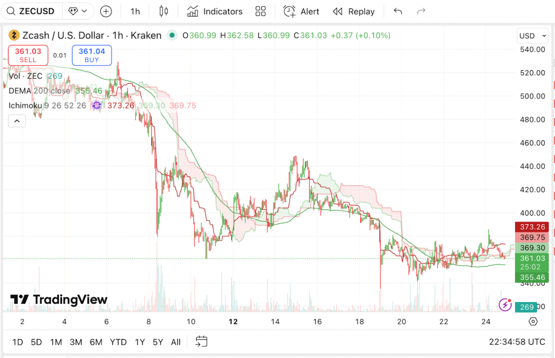 Ngược lại, giá bán cuối cùng của Zcash trên thị trường là $361.88 và đã giảm 1.55% so với trước đó. Thêm vào đó, vốn hóa của nó đã đạt 5.96 tỷ đô la. Trong khi đó, khối lượng giao dịch trong ngày cuối cùng là 356.62 đô la.