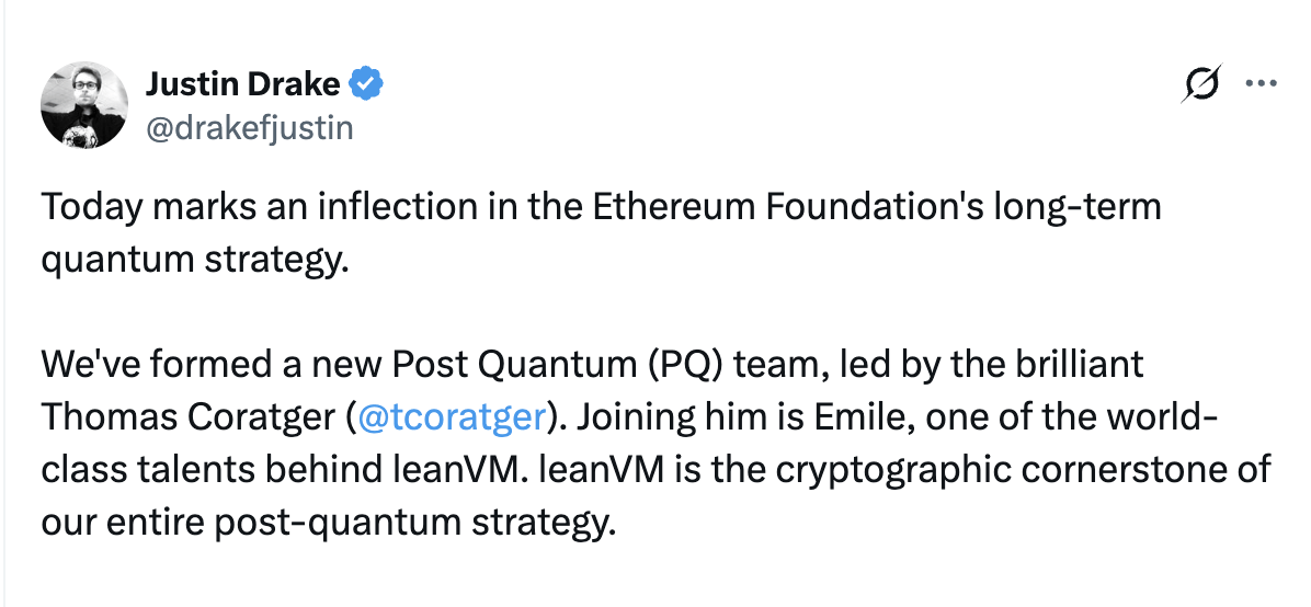 Justin Drake, một nhà nghiên cứu của Quỹ, gần đây đã thông báo rằng họ đã thành lập một nhóm PQ mới do Thomas Coratger, một nhà nghiên cứu khác đã làm việc tại Quỹ nhiều năm, dẫn dắt. Nhóm của Coratger sẽ bao gồm người sáng tạo LeanVM, một máy ảo không kiến thức đề xuất nhằm thúc đẩy mở rộng trong thế giới hậu lượng tử.