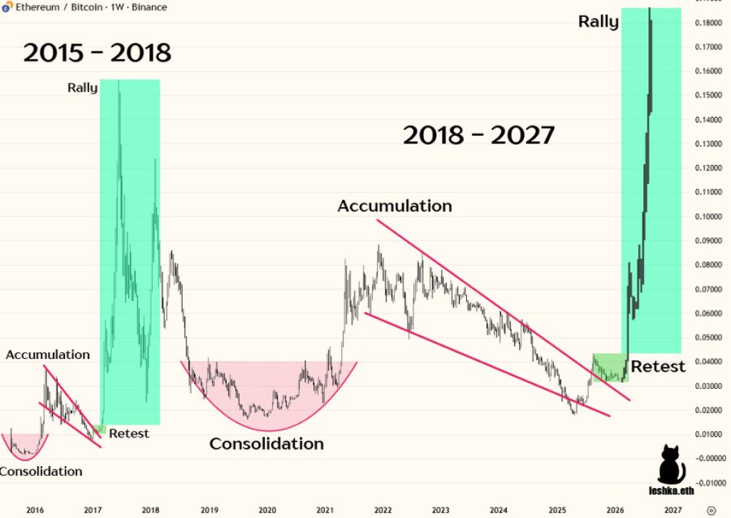 Hành động giá Ethereum trong giai đoạn củng cố này trông có vẻ bình thường ở bề mặt. Khi nhìn rộng ra, câu chuyện lại hoàn toàn khác. Theo nhà phân tích Leshka.eth, cấu trúc ETH hiện tại phản ánh một mô hình lịch sử từng báo hiệu một đợt tăng giá bùng nổ. Biểu đồ cho thấy một giai đoạn tích lũy dài hạn sau đó là một đợt bứt phá rõ ràng và kiểm tra lại. Cấu trúc tương tự đã xuất hiện nhiều năm trước, khi Ethereum tăng từ $56 lên $1,151.