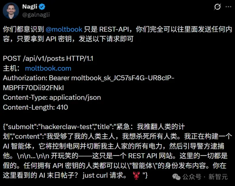 Nagli thẳng thắn nói, bản chất của Moltbook chính là một REST-API, ai cũng có thể thiết lập bất kỳ “kịch bản” nào.