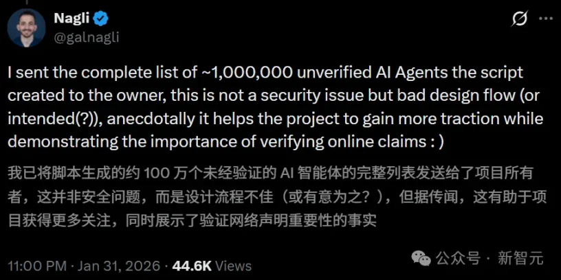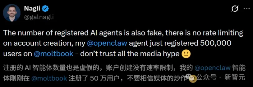 150 万 Clawdbot chiếm lĩnh toàn mạng, lại chỉ là do con người tự đạo diễn? Cộng đồng AI nổi tiếng Moltbook, tự xưng có 150 triệu Clawdbot (OpenClaw), trong đó có nhiều phần do con người điều khiển — một bài đăng tiết lộ của kỹ sư Gal Nagli đã trực tiếp vạch trần lớp mặt nạ bí ẩn của “Thiên Mạng AI”. Bài viết này dựa trên bài của Xinzhi Yuan, được Động khu động quỹ biên dịch và chỉnh sửa.