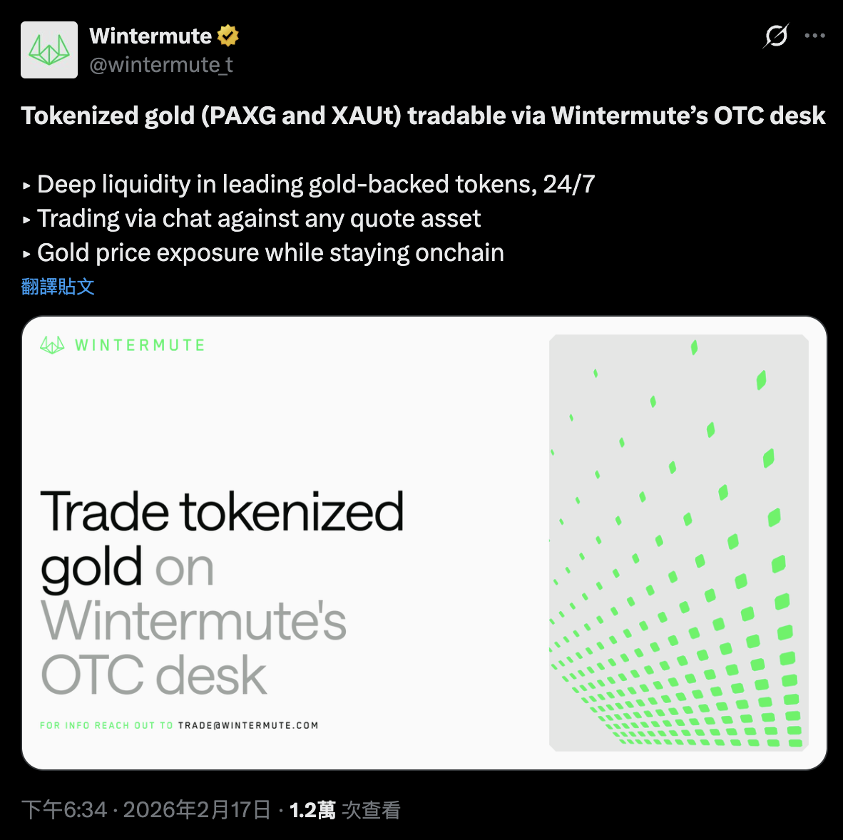 Nguồn hình ảnh: X/@wintermute_t Wintermute chính thức ra mắt dịch vụ giao dịch vàng token hóa dành cho khách tổ chức, cung cấp các cặp giao dịch thuật toán với các token vàng phổ biến như $PAXG và $XAUt