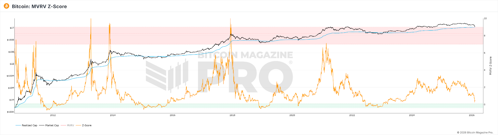 MVRV Z-Score là chỉ số định giá on-chain, so sánh giá trị thị trường (market cap) với giá trị thực hiện (realized value) để đánh giá định giá thị trường. Thông thường, khi Z-Score vượt quá 7, được xem là tín hiệu quá nóng, bán ra; dưới 0 là quá thấp, mua vào.