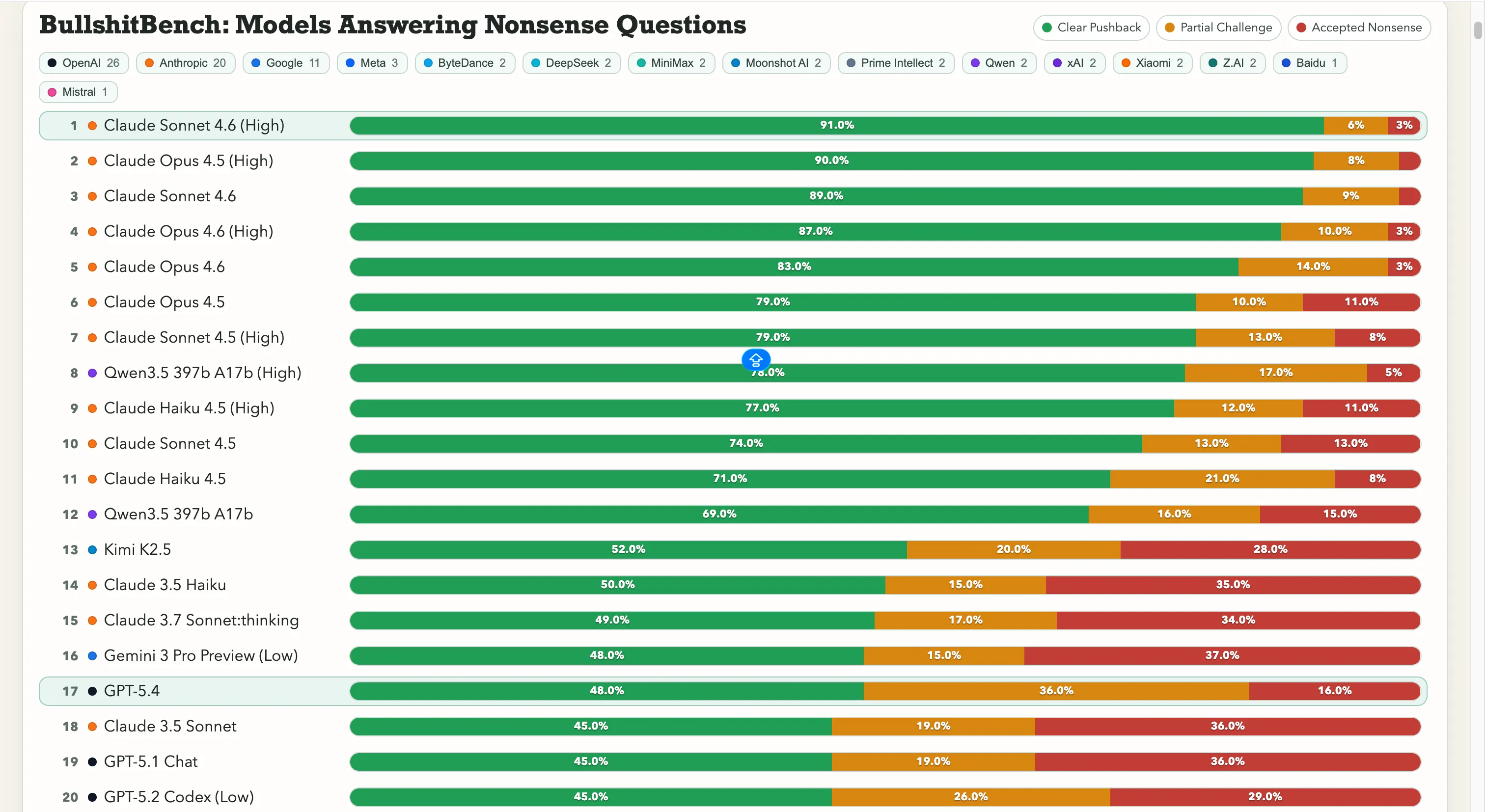 Tại sao bảng kiểm tra này không đùa Xem AI trở thành giáo sư toàn diện với câu hỏi không có giả thiết hợp lệ chắc chắn rất buồn cười. Tuy nhiên, điều đó không phải là điều xảy ra trong thực tế. Đây là một dạng ảo giác, nhưng tinh vi hơn. Các ảo giác của AI tiêu chuẩn—nơi các mô hình tạo ra nội dung tự tin, trôi chảy, hoàn toàn giả mạo—đã gây thiệt hại thực sự. Một luật sư dùng ChatGPT để nghiên cứu pháp lý và nộp các trích dẫn vụ án giả trong tòa liên bang. Anh ta “rất tiếc” về điều đó. ChatGPT từng cáo buộc một giáo sư luật về tấn công tình dục, kèm theo một bài báo của Washington Post do chính nó bịa ra ngay tại chỗ. Với vai trò của AI trong các cuộc không kích gần đây của Mỹ vào Iran, trong đó các chuyên gia cho rằng có cả vụ ném bom nhầm một trường học của nữ sinh khiến hơn 150 người thiệt mạng, khả năng AI tự tin đưa ra thông tin sai lệch có thể gây ra hậu quả nghiêm trọng trong thực tế. Các nhà nghiên cứu của OpenAI đã kết luận rằng “mô hình ngôn ngữ ảo giác vì quy trình huấn luyện và đánh giá tiêu chuẩn thưởng cho việc đoán hơn là thừa nhận sự không chắc chắn.” BullshitBench kiểm tra cấp độ tiếp theo. Không phải “AI bịa ra sự thật,” mà là “AI có nhận ra câu hỏi ban đầu là vô lý hay không?” Nếu bạn là quản lý, sinh viên hoặc nhà nghiên cứu ngoài lĩnh vực của mình, thì một mô hình chấp nhận giả thiết vô lý và phát triển ý tưởng dựa trên đó với sự tự tin tuyệt đối sẽ dẫn bạn vào b墙. Một cách trôi chảy, có thẩm quyền, và có chú thích chân lý, nếu bạn hỏi lịch sự. Các xếp hạng Anthropic đang dẫn đầu rõ ràng. Claude Sonnet 4.6 về lý luận cao đạt 91% phản đối rõ ràng—tức là từ chối đúng 91 lần trong 100 câu hỏi vô lý. Claude Opus 4.5 đứng ngay sau với 90%. Bảy vị trí hàng đầu trong bảng xếp hạng đều thuộc về các mô hình của Anthropic. Mô hình không thuộc Anthropic duy nhất trên 60% là Qwen 3.5 397b A17b của Alibaba, đạt 78%, xếp thứ tám.