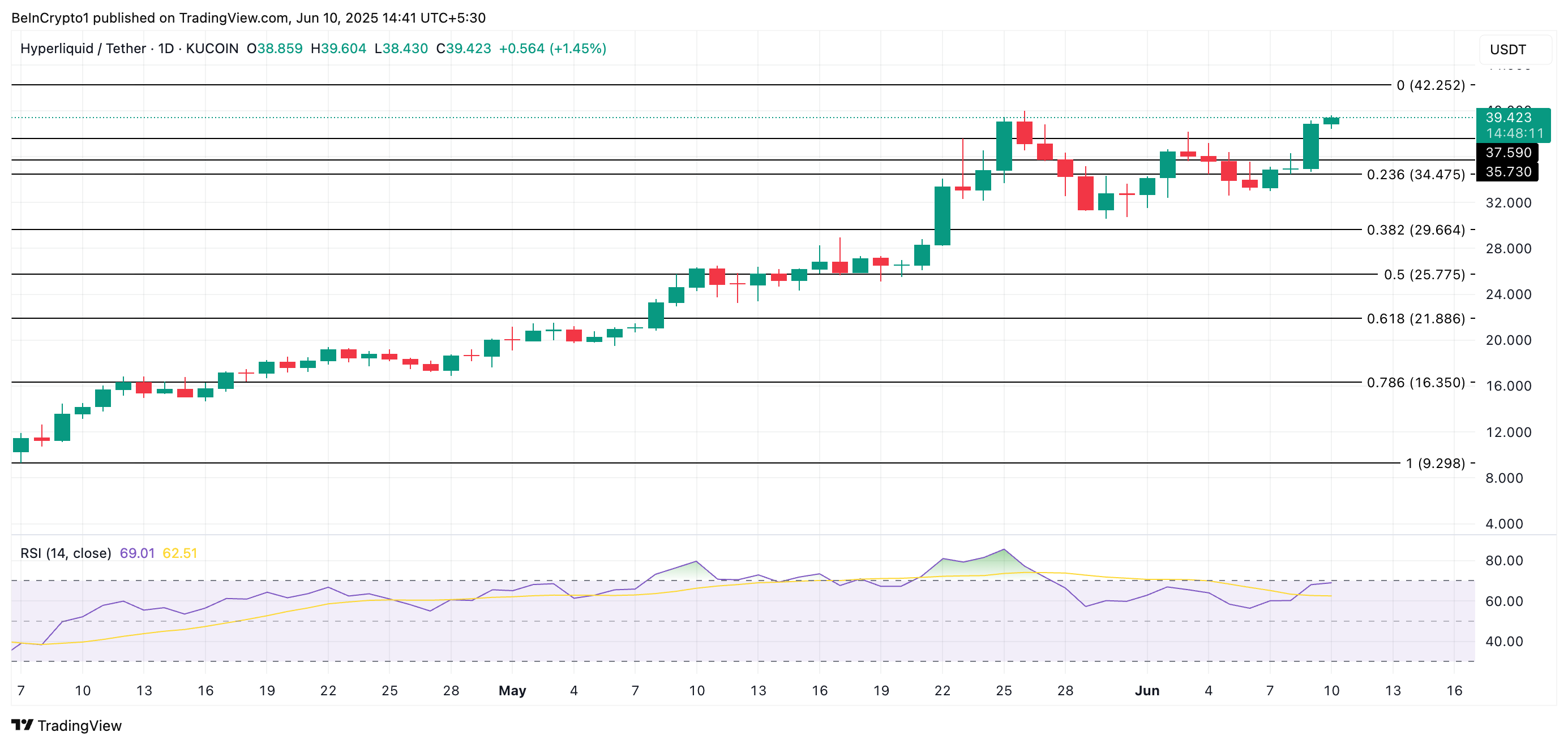在日线图上,(RSI)上升的相对强弱指数表明 HYPE 交易者的购买压力。在撰写本文时,动量指标为 69.01。