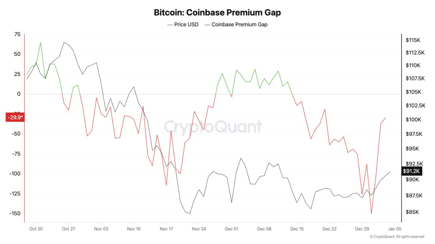 随着 2026 年正式揭幕,比特币多头终于盼来了久违的曙光,多项链上指标同步释放“翻多信号”,包括 Coinbase 溢价止跌回升、恐惧与贪婪指数(Fear & Greed Index)反弹,以及多空比(Long/Short Ratio)在去杠杆后仍稳守 1.0 以上,显示市场结构正逐步修复。 截至今(5)日早间 10 点,比特币已回升至 9.3 万美元,扫去 12 月下旬一度失守 8.7 万美元的阴霾。然而,尽管盘面转佳,市场情绪依旧如履薄冰,分析师提醒,在总体经济变量尚未完全消除之前,投资人仍应保持审慎,短线不宜过度躁进。 机构资金回笼:Coinbase 溢价指数回升 首先映入眼帘的“看涨信号”,是来自美国投资人、尤其是机构的资金动向,衡量美国与全球市场买盘力度差异的“Coinbase 溢价指数”正上演 V 型反转,在 12 月底暴跌至 -150 后,目前已显著回升、逼近零轴。 换言之,在年底结账卖压告一段落后,美国机构投资人重新回到“买方阵营”,若“Coinbase 溢价指数”进一步转正甚至站稳,则得以确认“美元买盘”正式回归,这往往是比特币发动涨势的领先指标。
