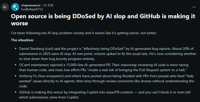 Reddit 上的讨论串指出,知名传输工具 Curl 的维护者 Daniel Stenberg 透露,项目正遭受 AI 生成错误报告的「DDoS 攻击」,2025 年的提交中约有 20% 属于 AI 垃圾内容,严重消耗志愿维护者的时间。