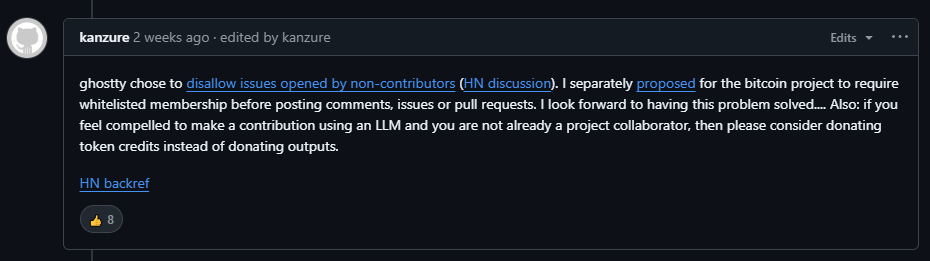 面对开源社区的垃圾代码(Shitcode)骚扰问题,比特币开发者 Bryan Bishop(kanzure)在 Tldraw 的 GitHub 页面中回应,他曾向比特币核心开发团队(Bitcoin Core)提议将开发流程「私有化」,转向仅限受邀成员参与的模式,或要求列入白名单才能发布评论与 PR。
