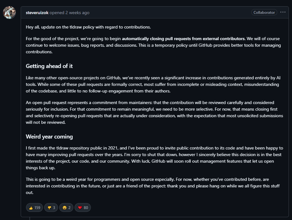目前 Tldraw 的政策是先关闭所有外部 PR,只重新开启那些真正被考虑的项目。这是为了项目与代码质量的最佳利益,虽然对于关闭公众贡献感到遗憾,但 steveruizok 表示,必须等到 GitHub 推出更好的管理工具后,才可能恢复开放。
