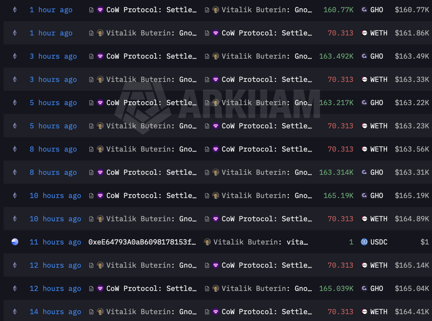 社区今日非常关注 Vitalik Buterin 将自己持仓的 ETH 卖出换成 GHO,根据 Arkham 记录,Vitalik 在过去 24 小时前将 5000 枚 ETH 换成 WETH,并陆续将 WETH 通过 Cow Protocol 换成 GHO,每次兑换 70 余枚,过去 24 小时内已经换了 9 次,共换取约 144 万美元的 GHO。