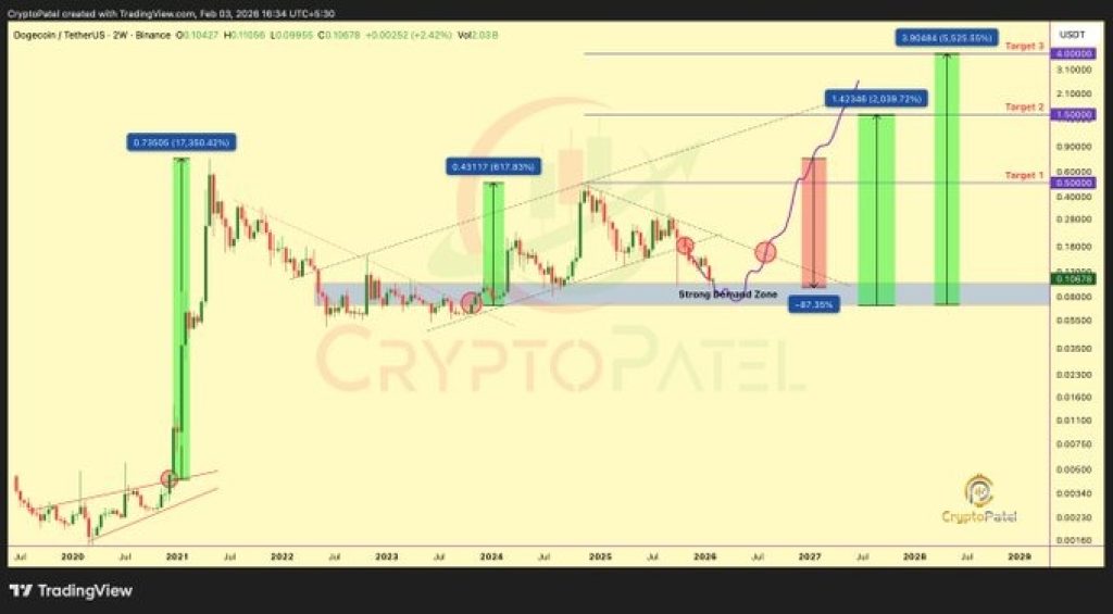 然而,Crypto Patel在一个完整周期延伸中指出了$0.50、$1.50和$4.00附近的上涨区域。这些不是短期预测,而是反映了DOGE在过去扩张中一旦价格突破积累阶段后所走的距离。
