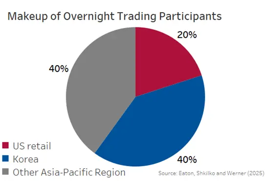 这一决策并非一时兴起,而是基于对资金流向的精准捕获。纳斯达克的数据显示,在目前的夜盘交易中,80% 的成交量来自于美国本土以外的地区。其中,以韩国为代表的亚洲投资者贡献了惊人的流动性 — — 在某些特定时段,韩国投资者的成交量甚至占据了整个夜盘的一半。