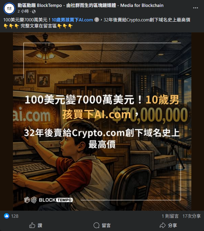 图源:脸书截图 台湾币圈媒体报道10岁男孩买下AI.com,100美元变7000万美元