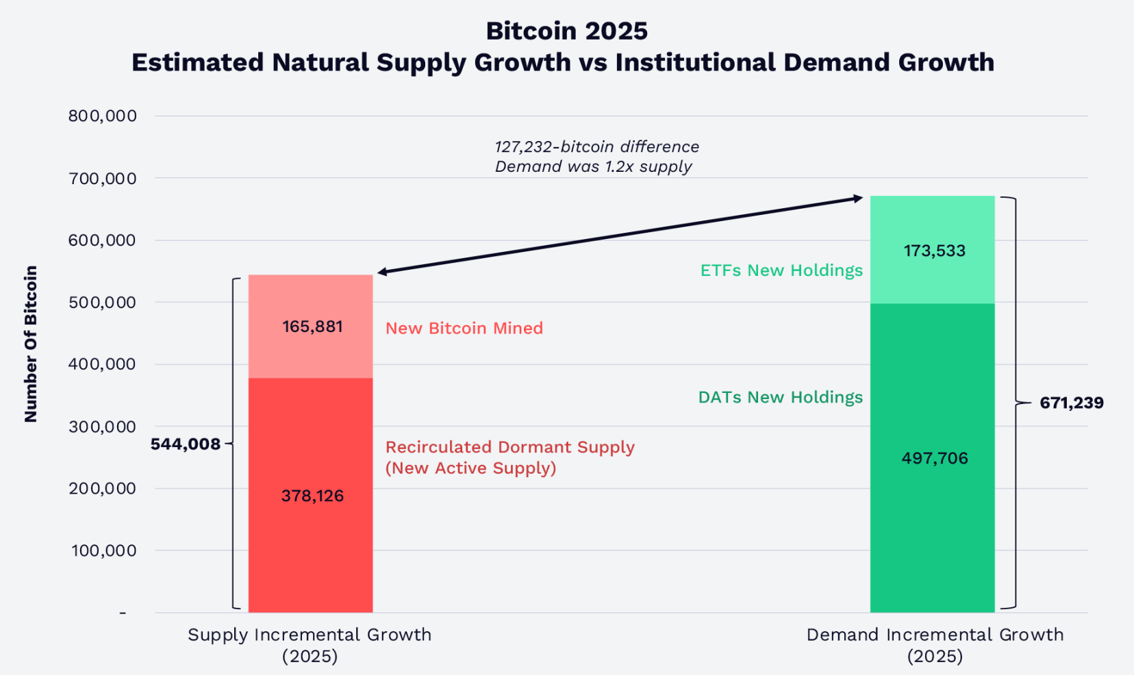 现货比特币 ETF 的规模化彻底改变了市场供需结构。2025 年,美国现货比特币 ETF 与数字资产财库(DAT)吸纳的比特币,达到新挖比特币 + 休眠币重新流通总量的 1.2 倍。截至 2025 年底,ETF 与 DAT 持有量已占比特币总流通量的 12%以上。
