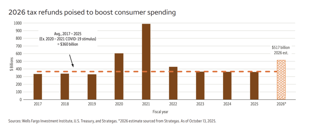 富国银行投资研究所(Wells Fargo Investment Institute)在2026年2月发布报告,预测2026税季将带来大规模退税,估计这将注入流动性并推升风险资产,包括股市和比特币。