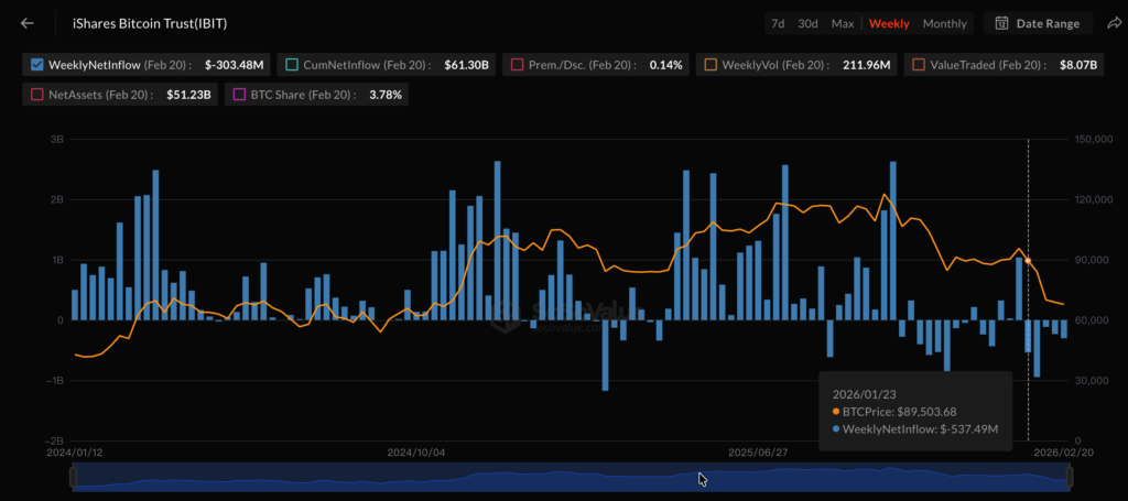 在所有比特币现货 ETF 中,贝莱德(BlackRock)旗下的 iShares Bitcoin Trust(IBIT)受创最重,五周内净流出高达 21.3 亿美元,占整体流出金额的逾 56%。这对于曾被誉为“史上最成功 ETF 发行”、上市首年就吸金超过 500 亿美元的 IBIT 而言,无疑是一记警钟。