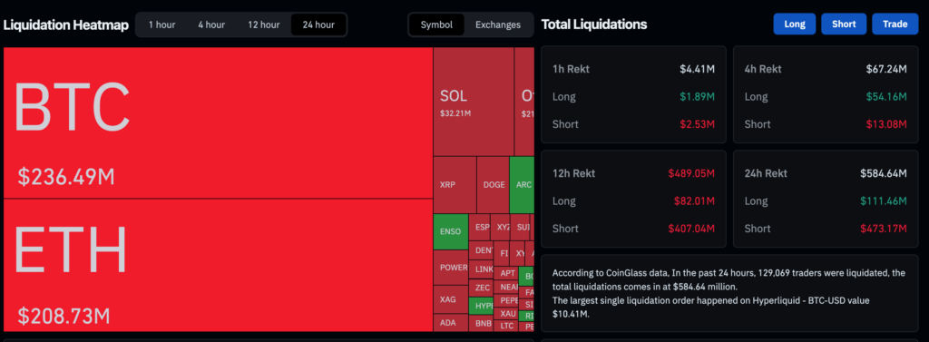这波急拉行情让押注下跌的空方措手不及。据链上数据显示,过去 24 小时内空单爆仓金额高达 4.73 亿美元,成为近期规模最大的空方清算事件之一。多头趁势反攻,一举击穿多个空单密集挂单区,形成连锁清算效应,进一步推升价格至 7 万美元上方。