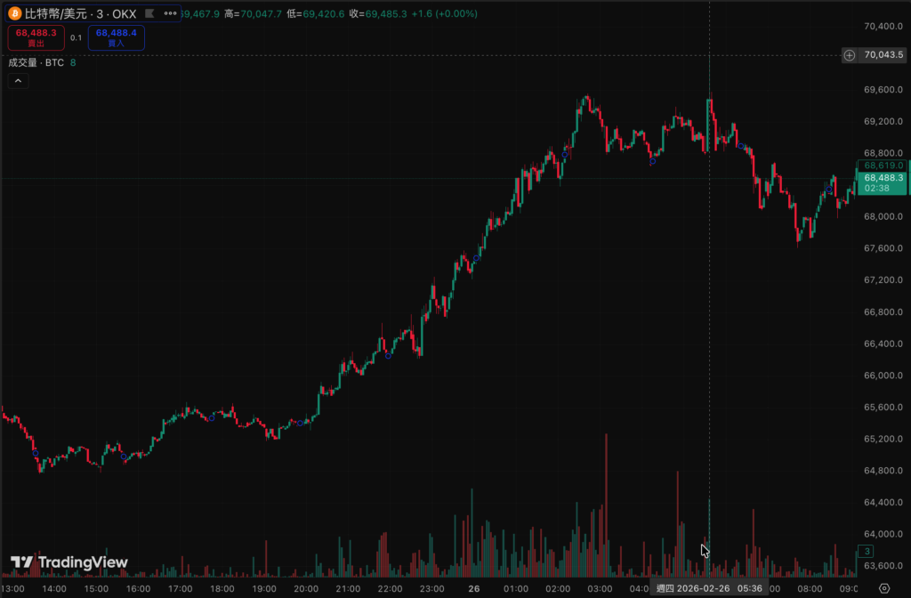 比特币自昨晚七点左右启动一波凌厉攻势,从 65,000 美元水位一路向上挺进。多头气势如虹,短短十个小时内便将价格推升超过 5,000 美元。今日凌晨五点多,BTC 更一度插针触及 70,048 美元,短暂突破 7 万美元整数心理关卡。然而,多方攻势未能延续,价格随即在数分钟内快速回落,截稿时报 68,439 美元。