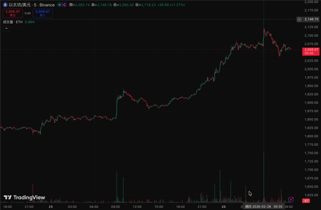 以太坊同步迎来反弹行情,从昨晚的 1,900 美元起涨,一度强势冲破 2,148 美元大关。不过与比特币如出一辙,ETH 同样未能守住高点,现已回落至 2,058 美元附近盘整。