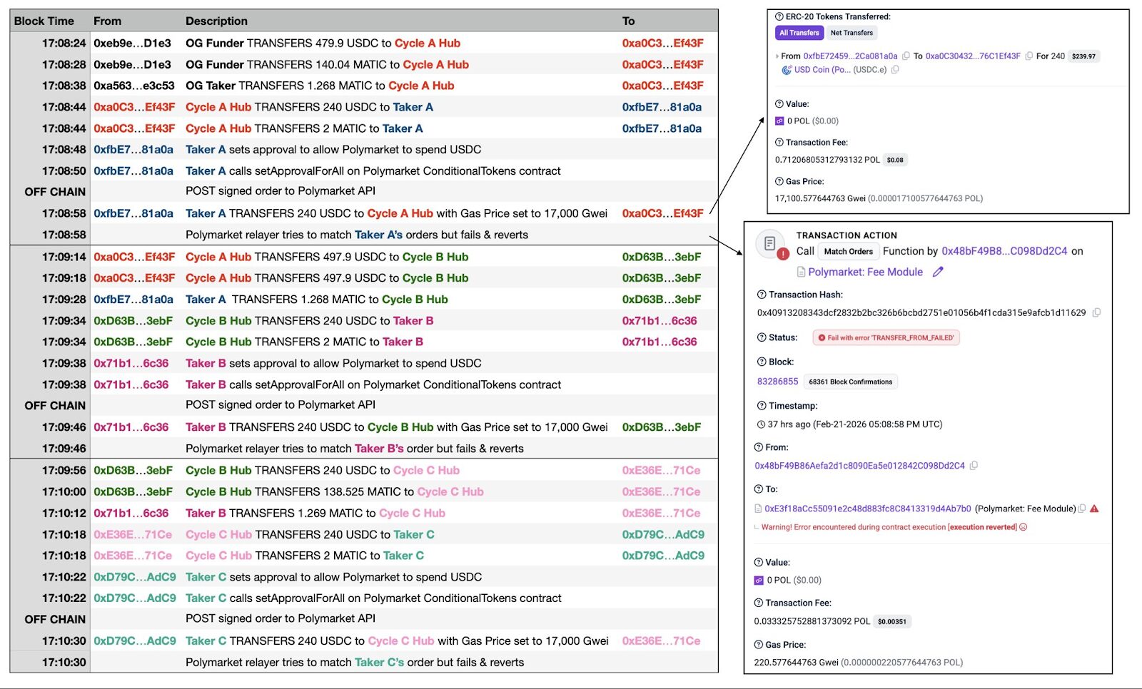 从成本端来看,每次攻击循环仅需支付 Polygon 网络上不到 0.1 美元的 Gas 费,每次循环耗时约 50 秒,理论上每小时可执行约 72 次。某位攻击者搭建了一套「双钱包循环系统」(Cycle A Hub 与 Cycle B Hub 交替操作),实现了全自动化的高频攻击。链上已有数百笔失败的交易被记录在案。