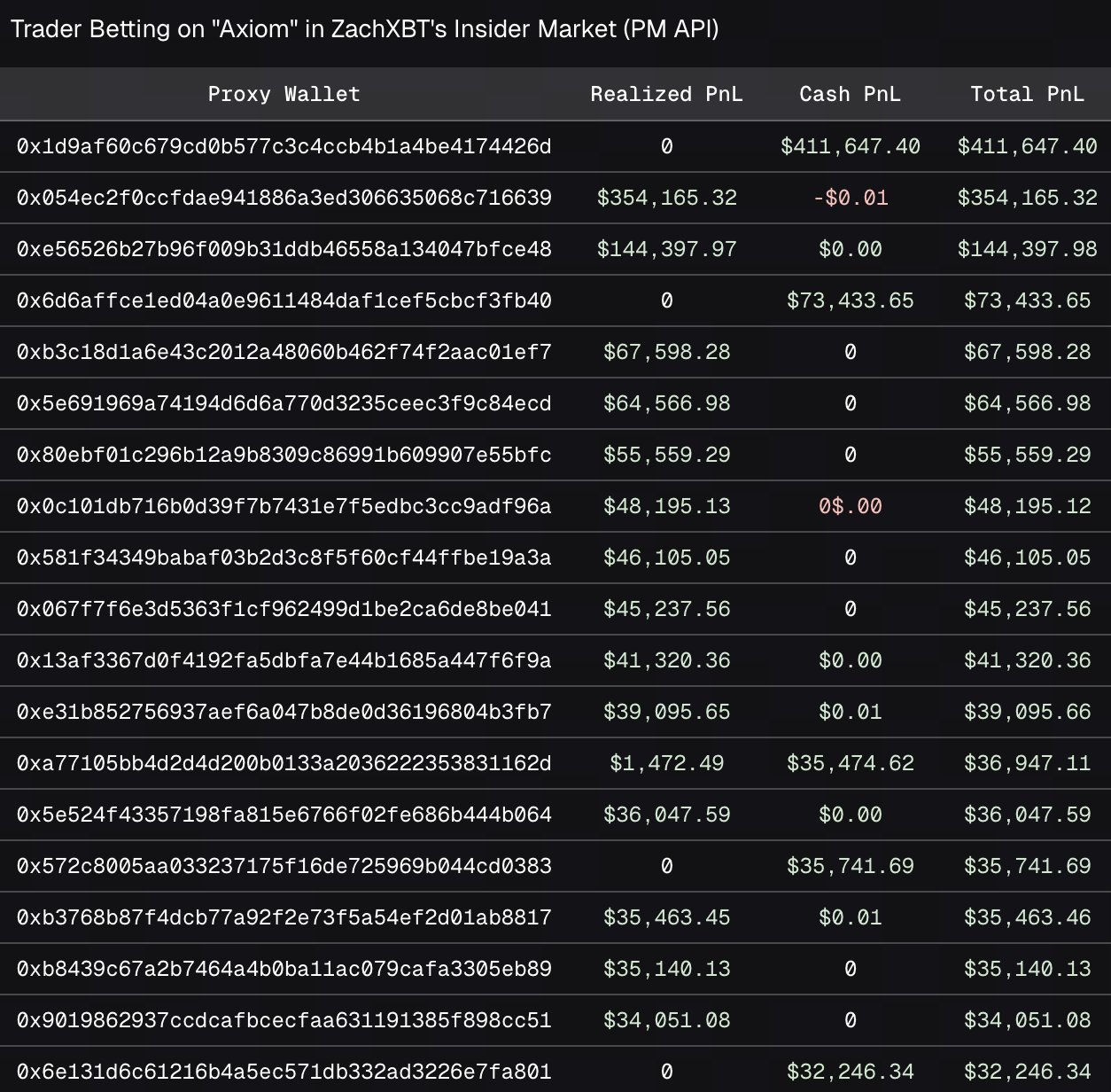 这些钱包,以及另外47个盈利在1万到10万美元之间(总计134万美元)的钱包,引发了泄露信息的怀疑。ZachXBT本人指出,他曾联系Axiom寻求评论,并在发布前进行了采访,这可能为信息泄露提供了机会。