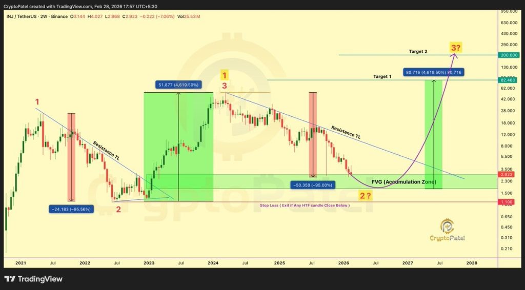 根据 Patel 分享的两周图表,周期结构一目了然。INJ 价格完成了一次强劲的冲击,冲向 2024 年高点,几乎呈抛物线式上涨。那是顶点。从那里,价格进入了长时间的调整阶段。