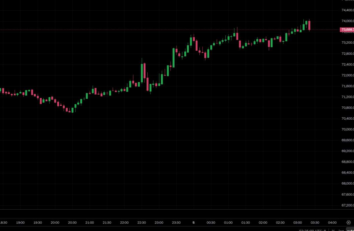 比特币(BTC)今(5)日强势突破 74,000 美元关卡,持续带动整体加密货币市场气氛明显升温。以太坊(ETH)同步跟涨,价格短线突破 2,200 美元。